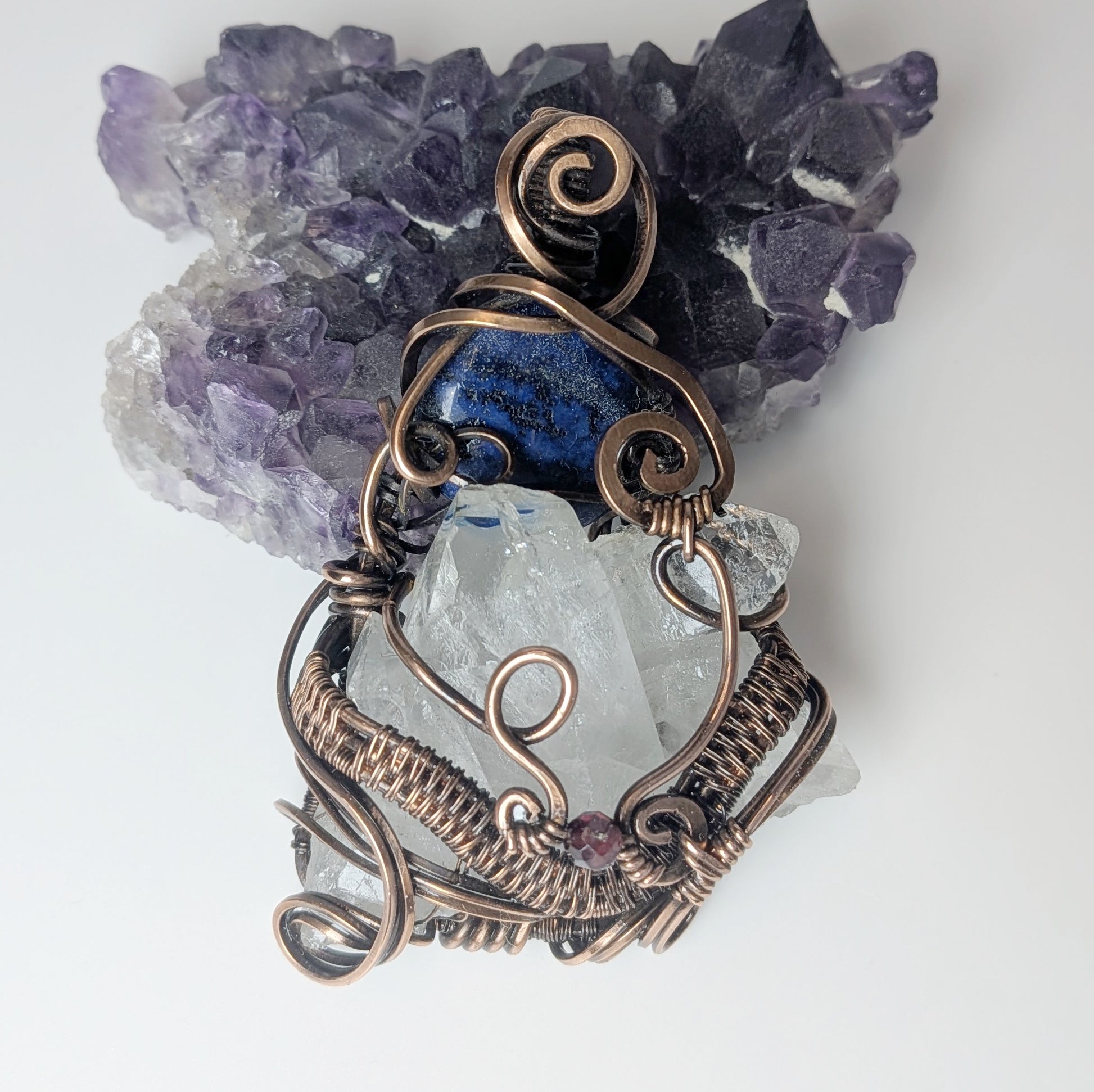 I've wanted to wrap this crystal for a long time, my inspiration were mountains, imagining the shape of the crystals as icy tundra mountain tops framed in woven copper and topped with blue sky (lapis). If you're looking for a new chunky pendant, this is the one!