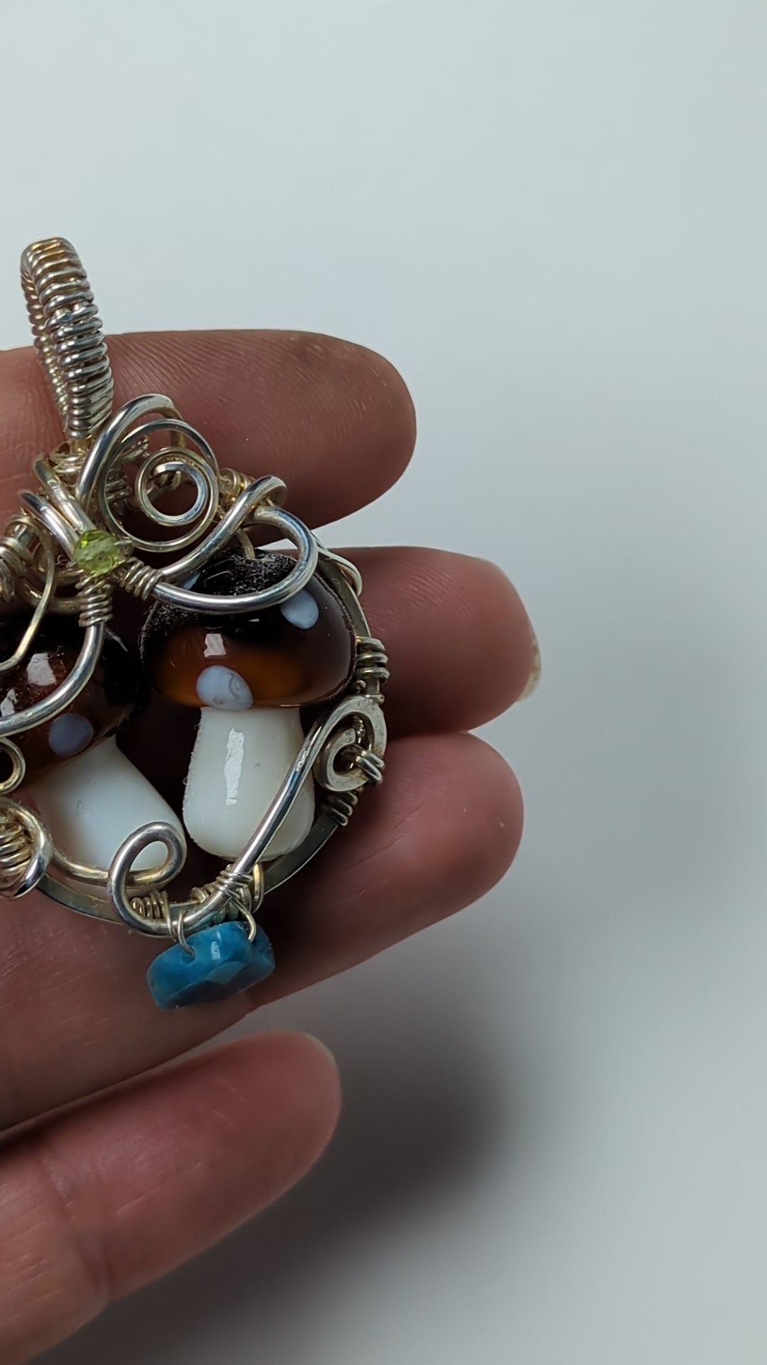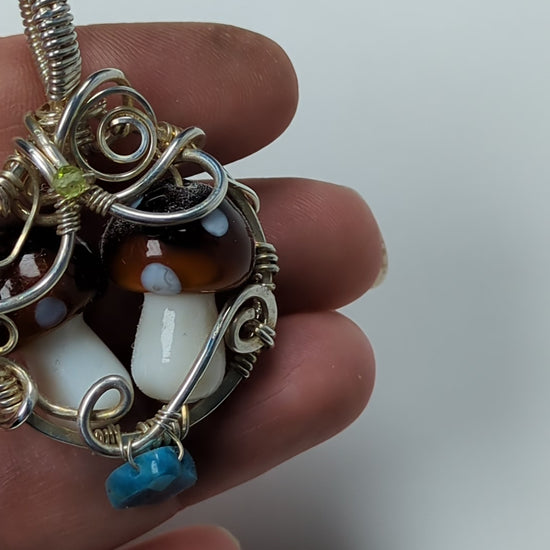These mushroom pendants are one of my favorite designs! I like to do 1-3 mushrooms together in a circular metal frame that I hand make and hammer to make it sturdy, then I decorate with beads that stand out to me.
