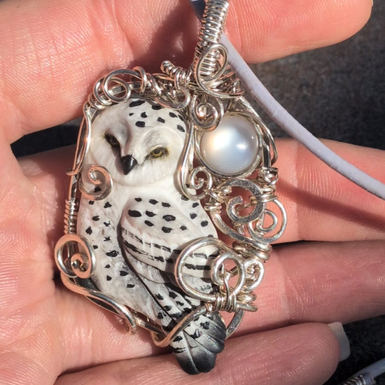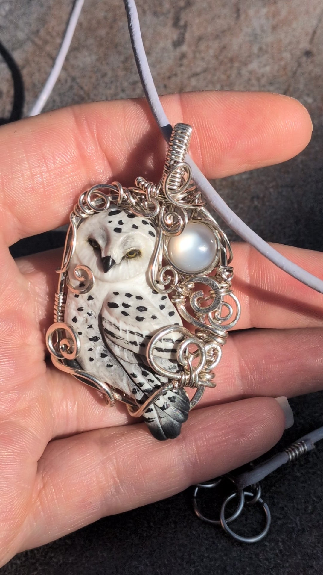 This is one of four owl theme pendants in a timed release on my shop! The one and only of this specific design! Moonstone is one of my favorite stones to pair with the owl jewelry I make, it's also just one of my favorite stones in general. Silky moonstone, unlike rainbow moonstone that has a beautiful yellow and blue flash, as a soft flash in the light. The small size of the cabochon and the angle were set to really create the vibe of the moon. The Snow Owl was made by a Ukrainian Polymer artist who's work I buy a lot of!
