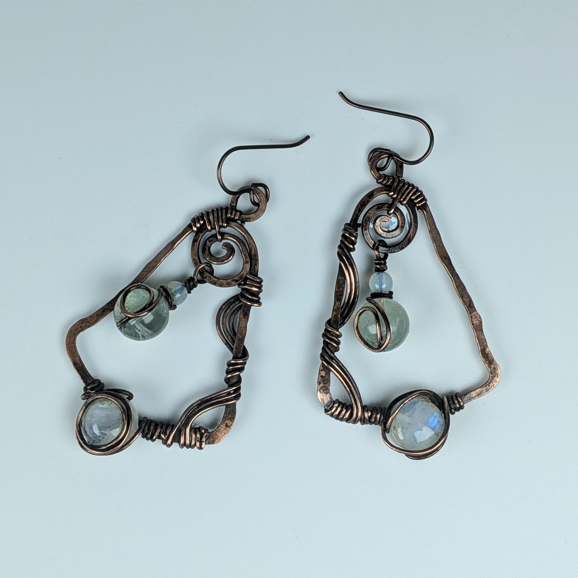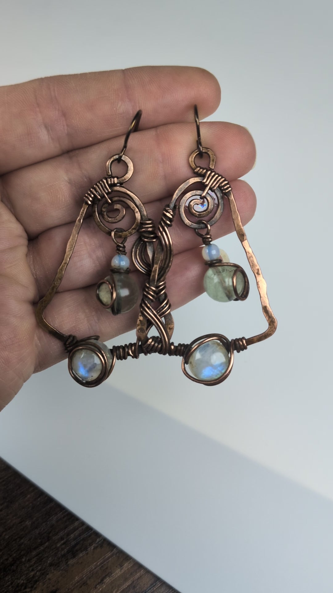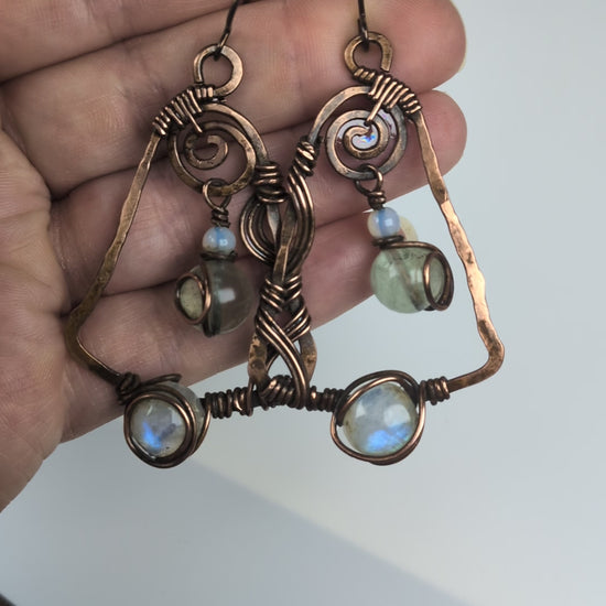 I recently learned how to fasten small circular gemstones like the rainbow moonstone on these earrings onto most anything and so I really wanted to make a pair of earrings with them as a center piece. I just love how flashy these moonstones are!