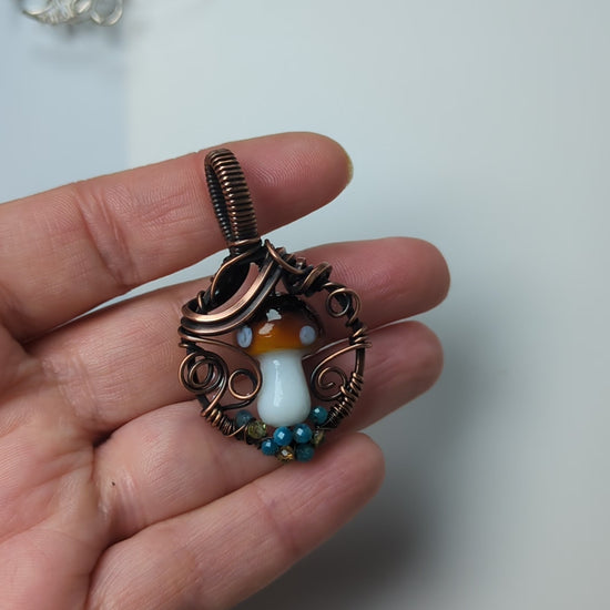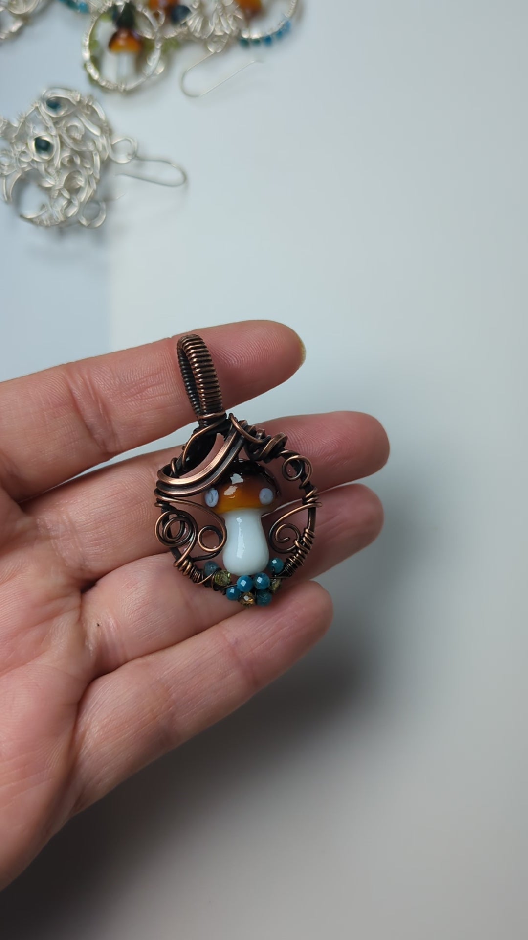 I was going to a minimalist mushroom pendant this time, the shades of brown from the copper work so well with the mushroom itself, plus the little bits of peridot and apatite make it sparkle!