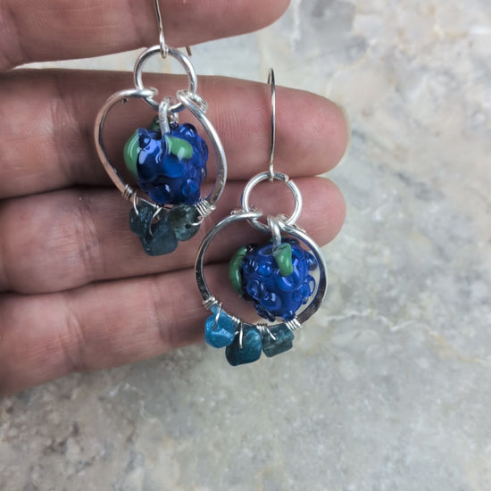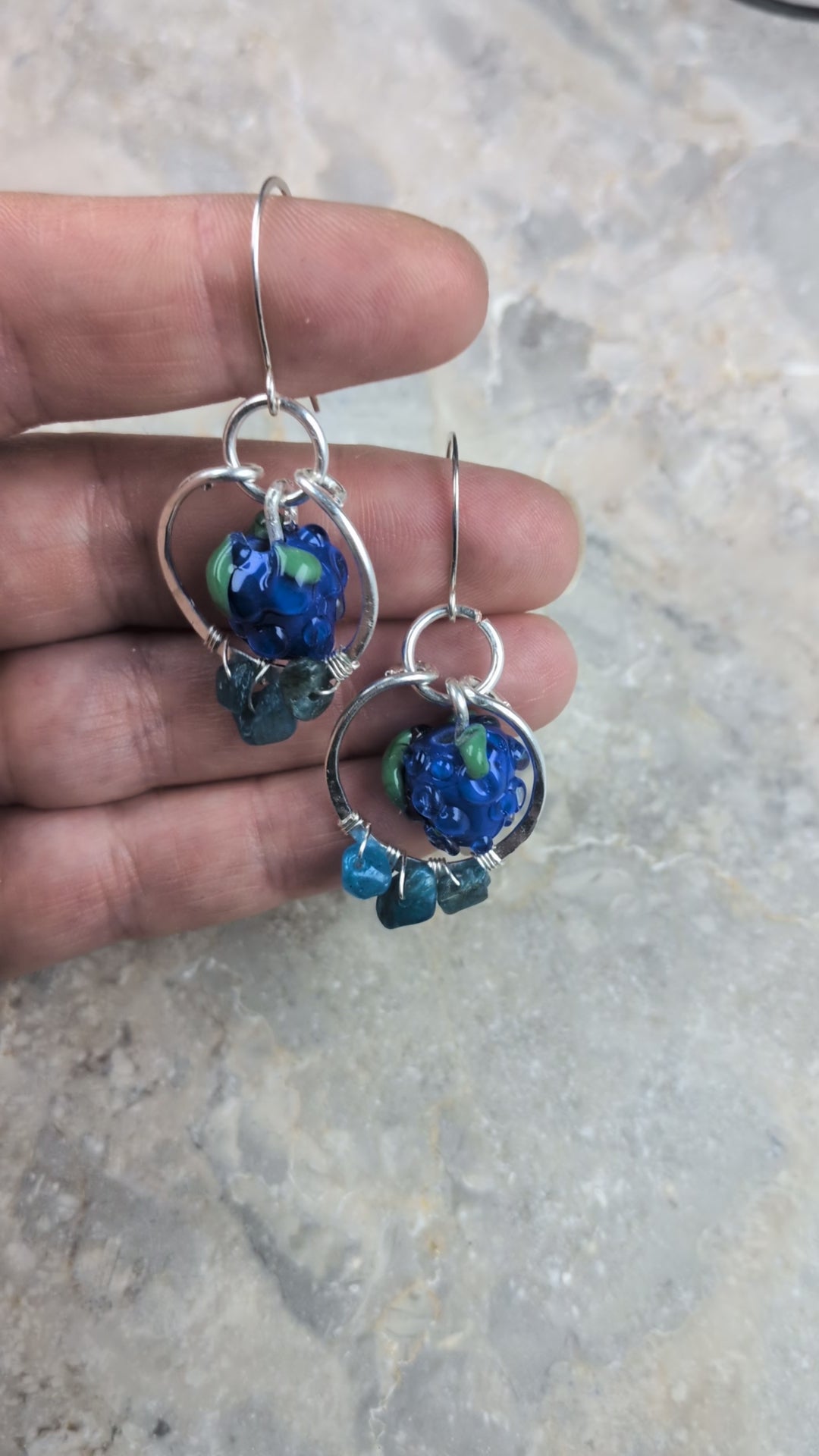 These earrings are made with lampworked glass beads that I made myself over hot flame, and were then annealed in a hot kiln overnight! I know blue raspberries don't technically exist but I couldn't help make a mixed media piece that includes my handmade glass beads and apatite!
