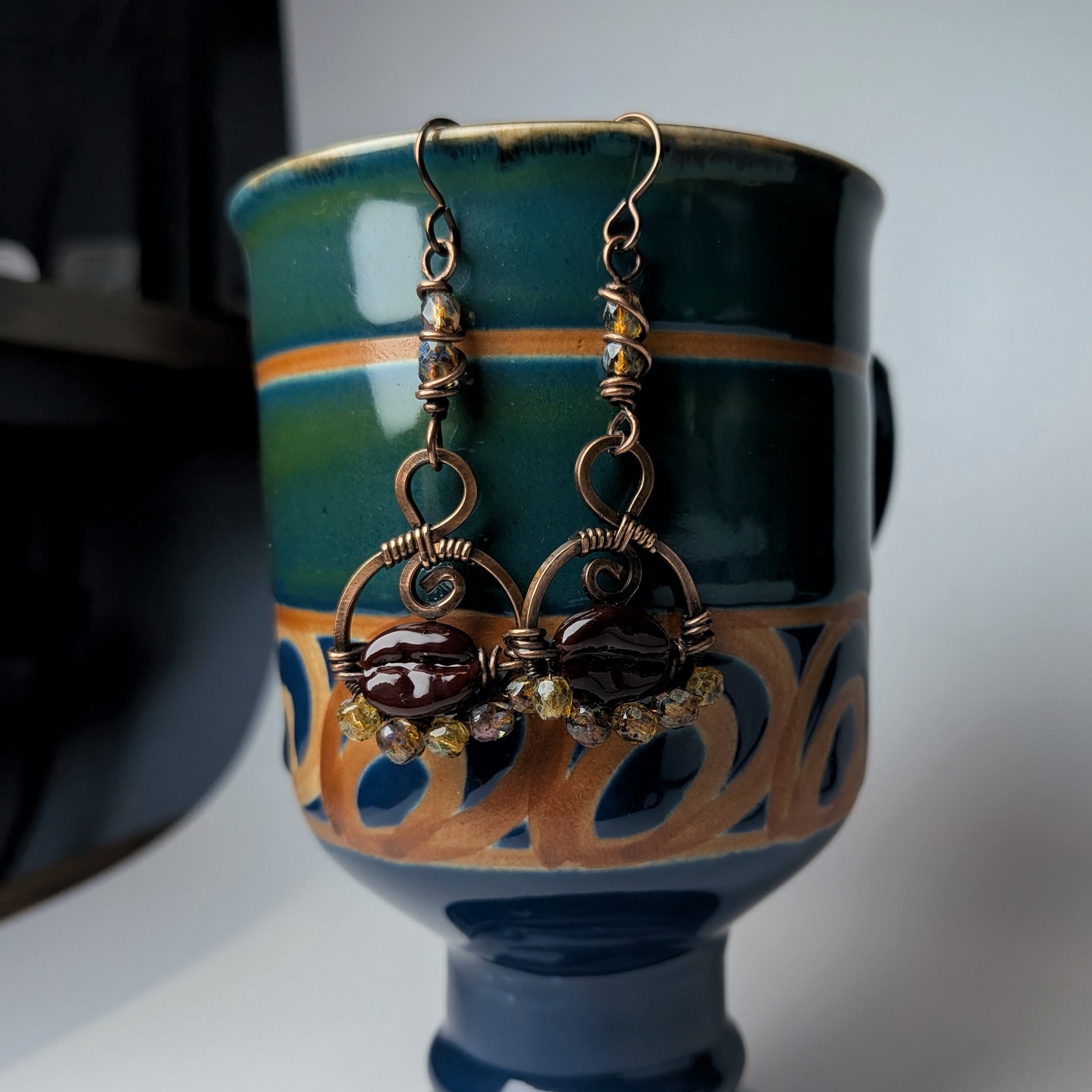 These coffee beans are so cute! I wish I had more of them! The antiqued copper really brings out the deep rich brown and sparkly glass beads. The coffee beans are lampwork beads from a Bulgarian lamp work artist, I hope to continue to support them as their work is amazing quality!