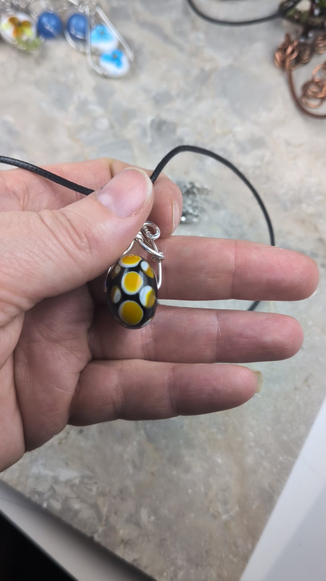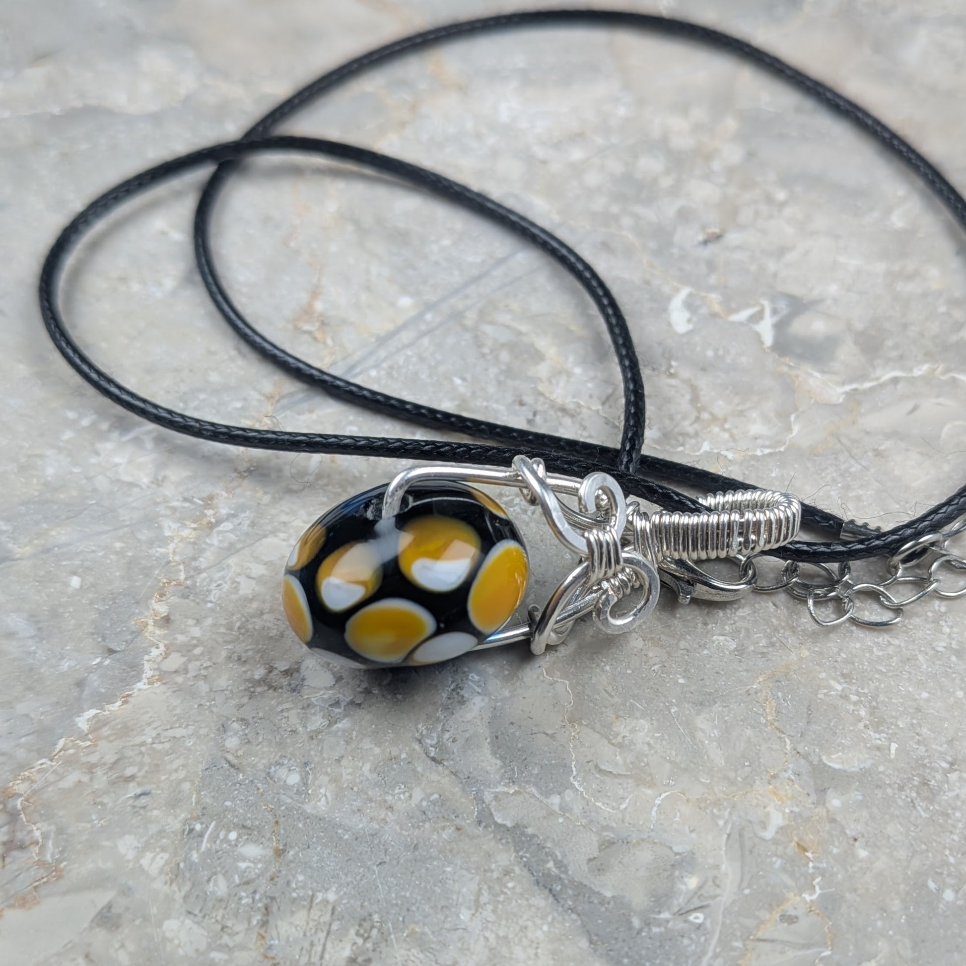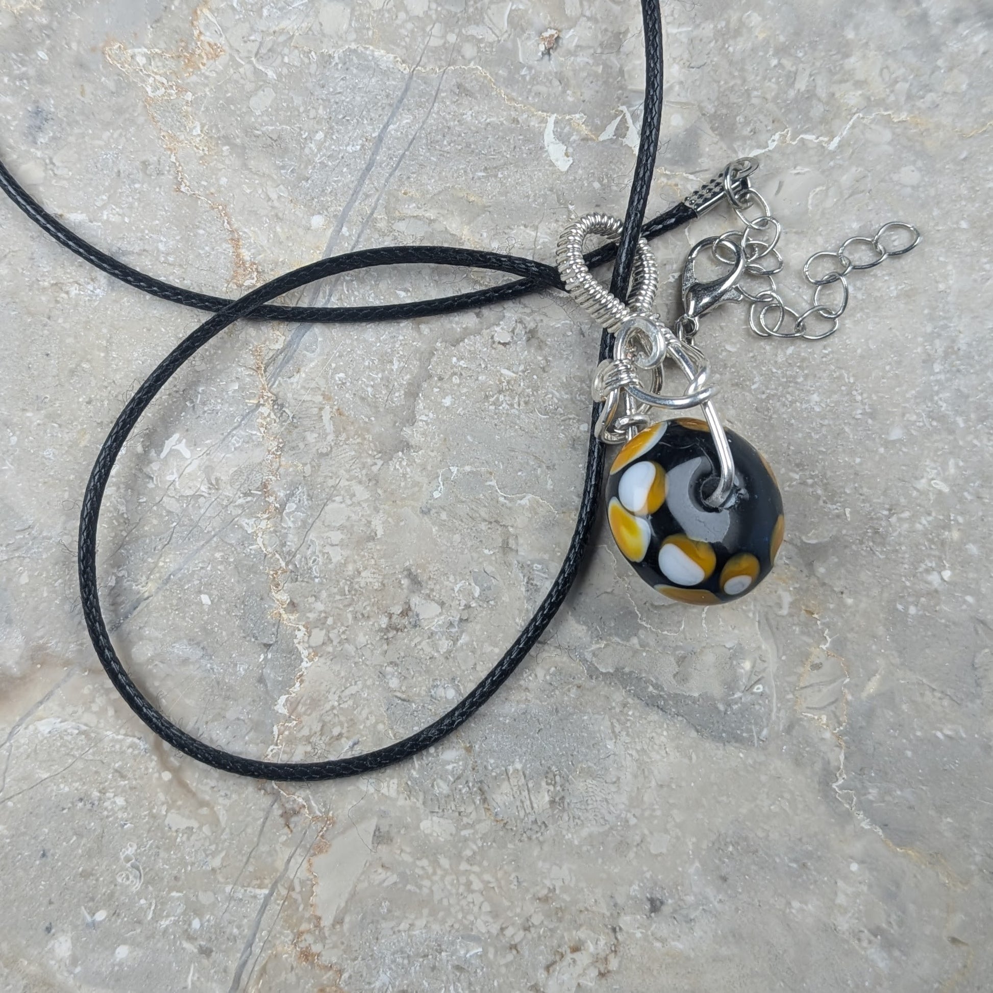 This necklace has a large handmade lampwork glass bead, made by myself over a torch flame and then annealed to harden my work. I wrapped the bead onto a bail I made myself and attached it to a (premade) cotton necklace. The bead fully spins and is great for that jewelry fidgeter in your life (or for you if you're like me and love a good fidgety item!)