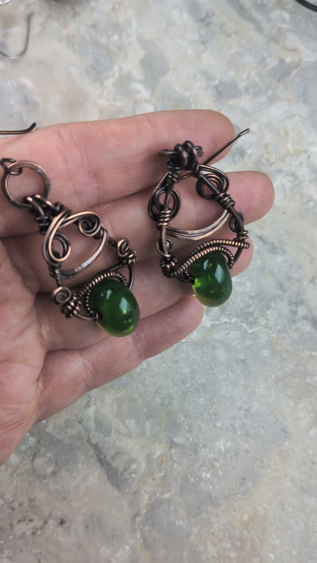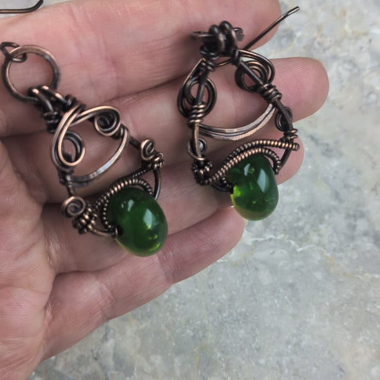 These earrings are made with lamp worked glass beads that I made myself over hot flame, and were then annealed in a hot kiln overnight! These earrings are especially cool because I added the beads onto the earrings first and then wove copper around them <3