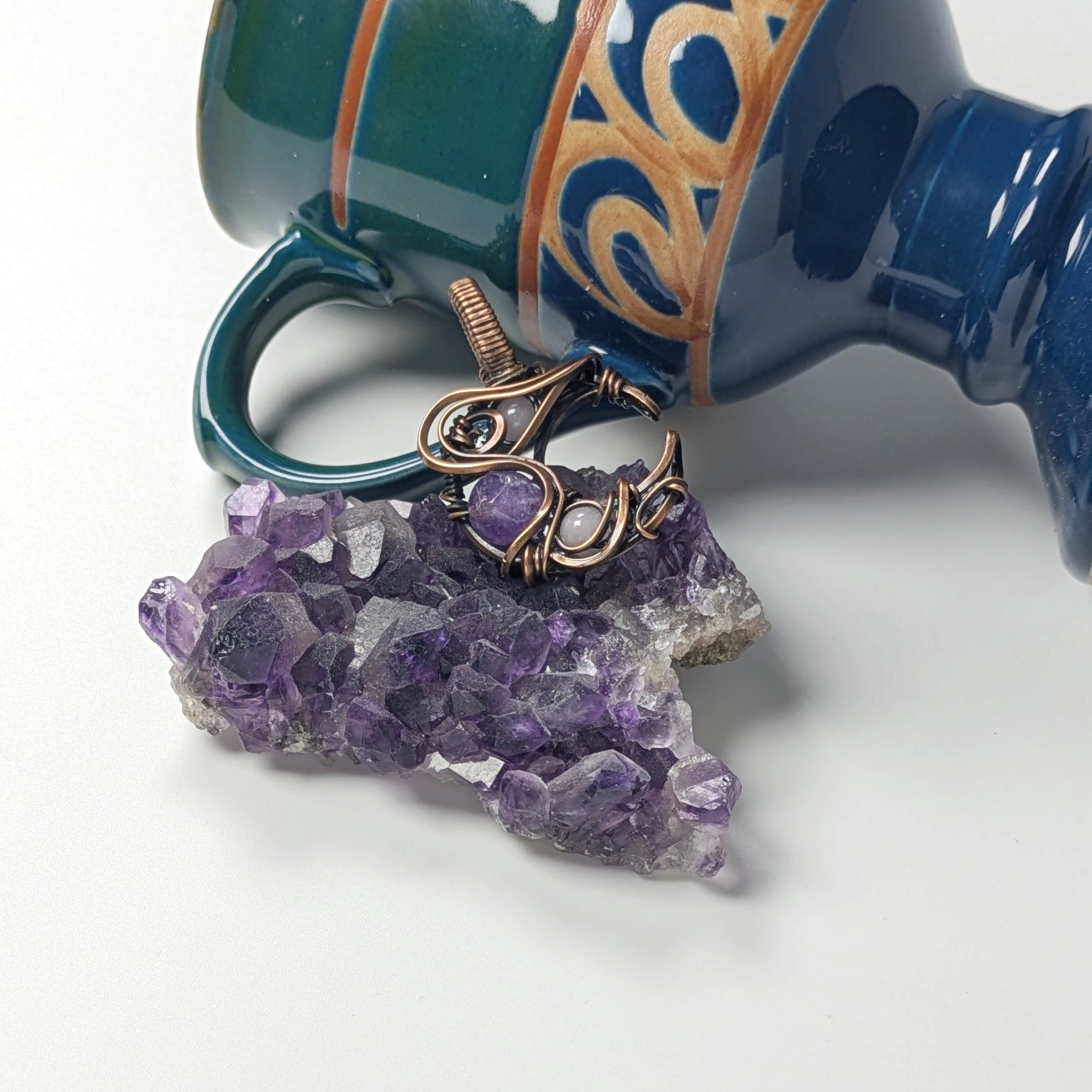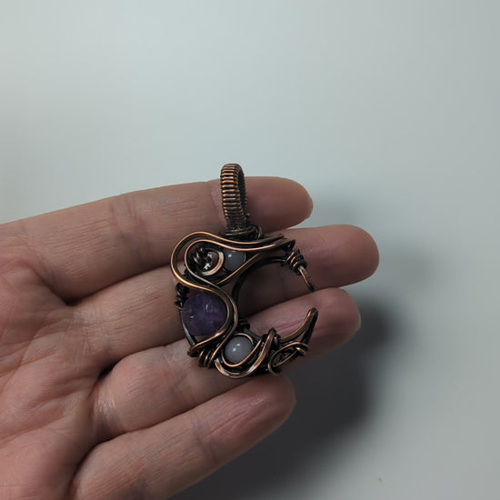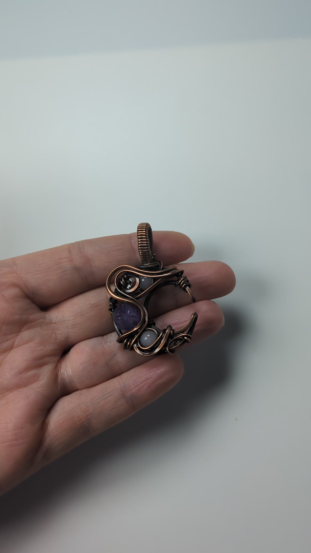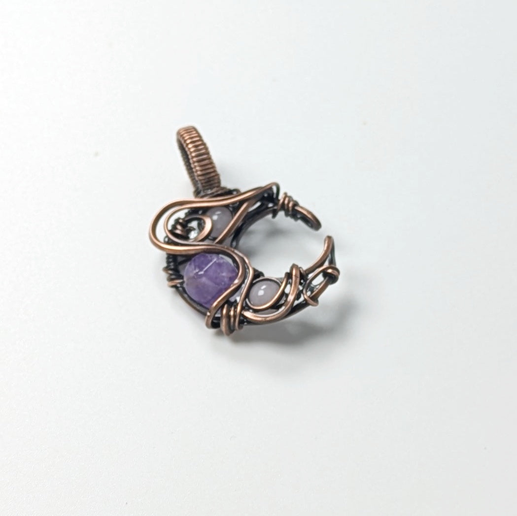 Moon pendants are one of my favorite designs that are just endless in their styles and make. This one is oxidized copper wrapped with an amethyst bead and some pale purple beads as accents!