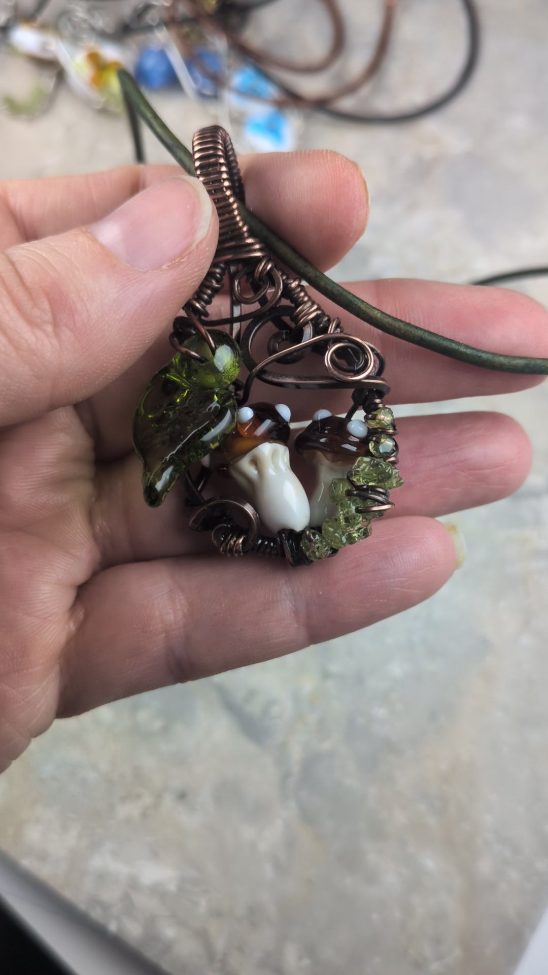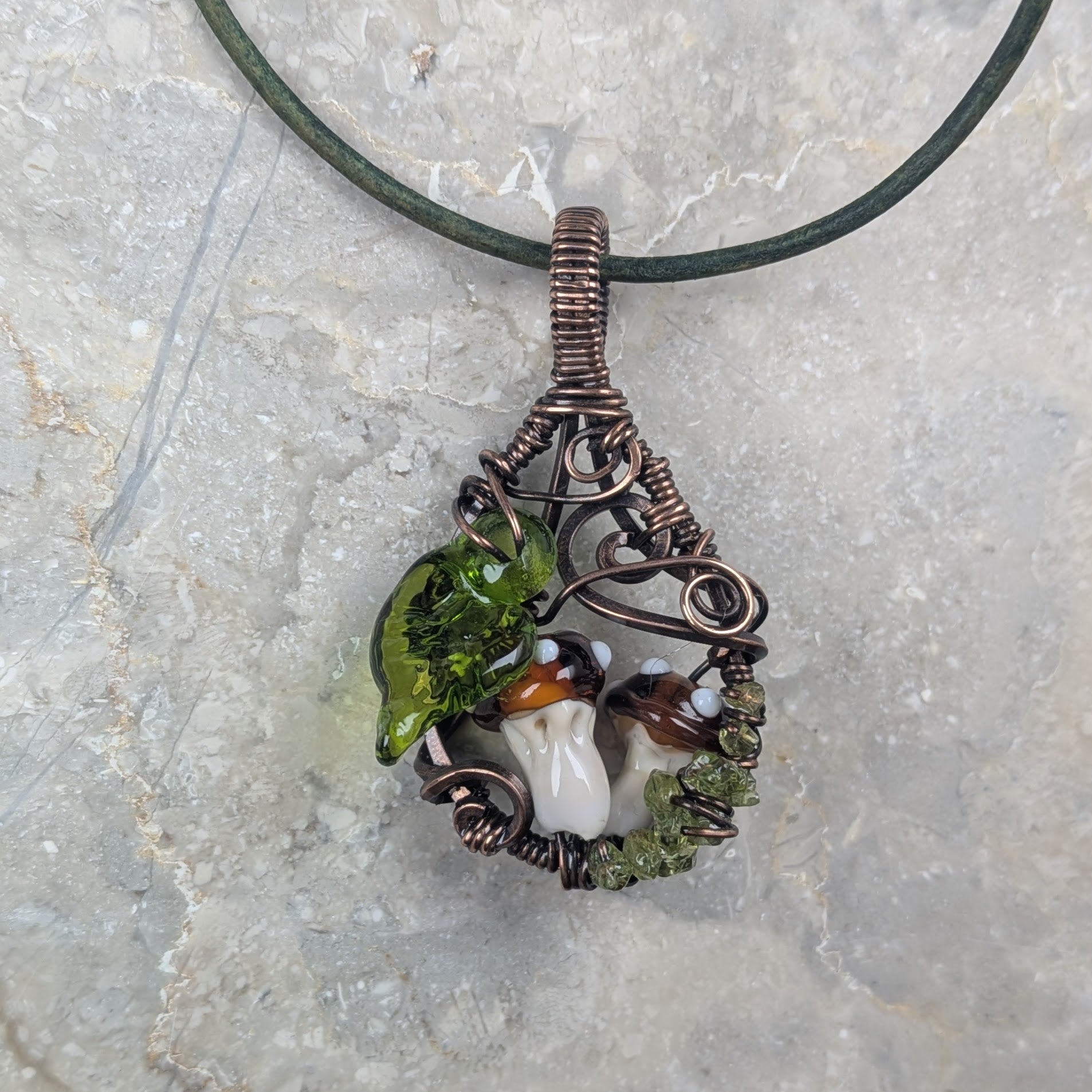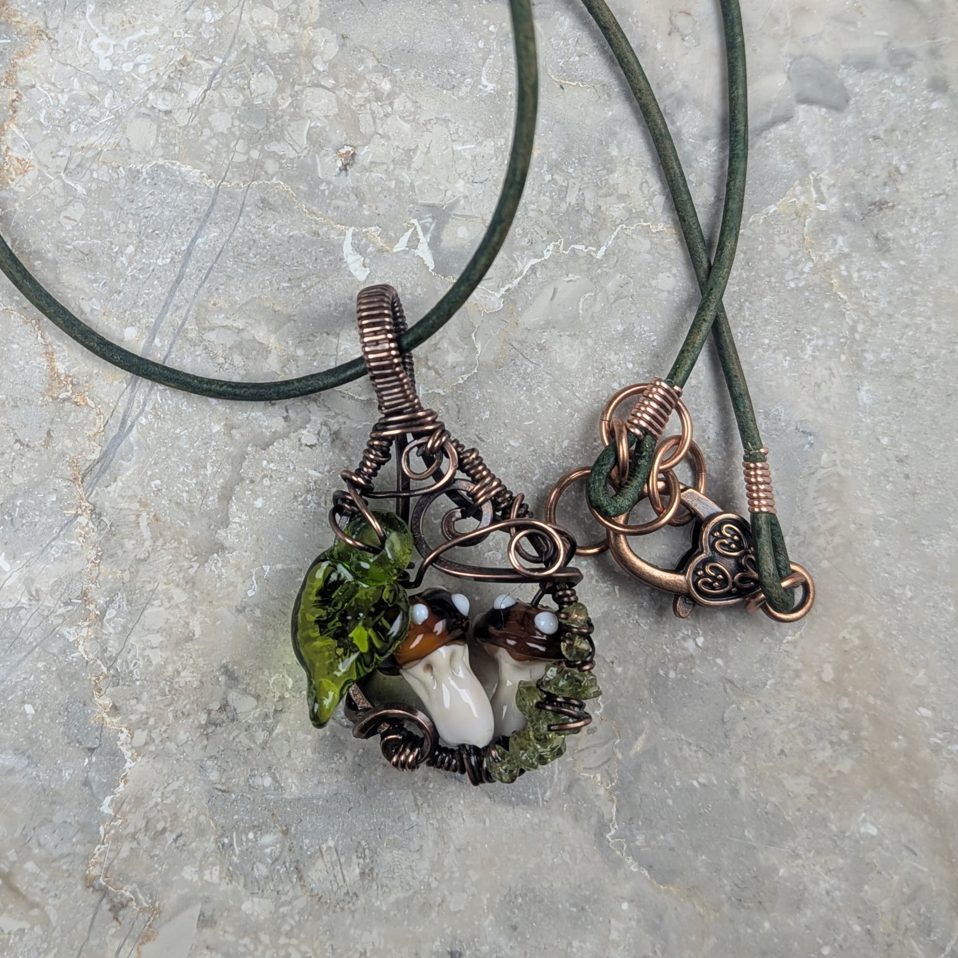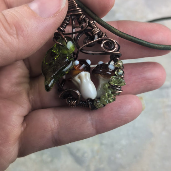 This necklace has two handmade lampwork glass mushrooms and one leaf, made by myself over a torch flame and then annealed to harden. I wrapped everything onto a copper frame that I decorated with spirals, peridot, and weaving! It is all attached it to a handmade leather necklace.