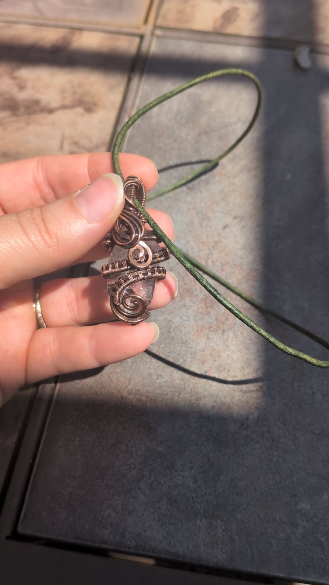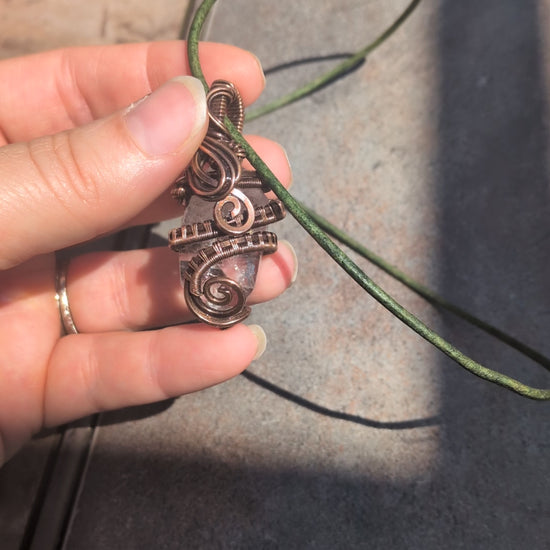 I really enjoy wrapping clear crystals in unique ways! This is a beautiful small crystal point that I have wrapped in a wire weave. I have also oxidized and polished the piece, with a good coat of enamel to prevent further oxidation.